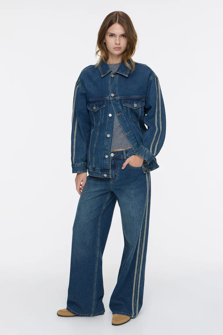 Pantalón de jean con diseño de pierna ancha y tiro medio. Presenta cinco bolsillos funcionales y un detalle distintivo de bandas laterales a lo largo de las piernas. Ideal para lograr un look relajado y urbano en cualquier ocasión cotidiana. Su diseño versátil permite combinarlo fácilmente con diferentes tipos de calzado y prendas superiores.