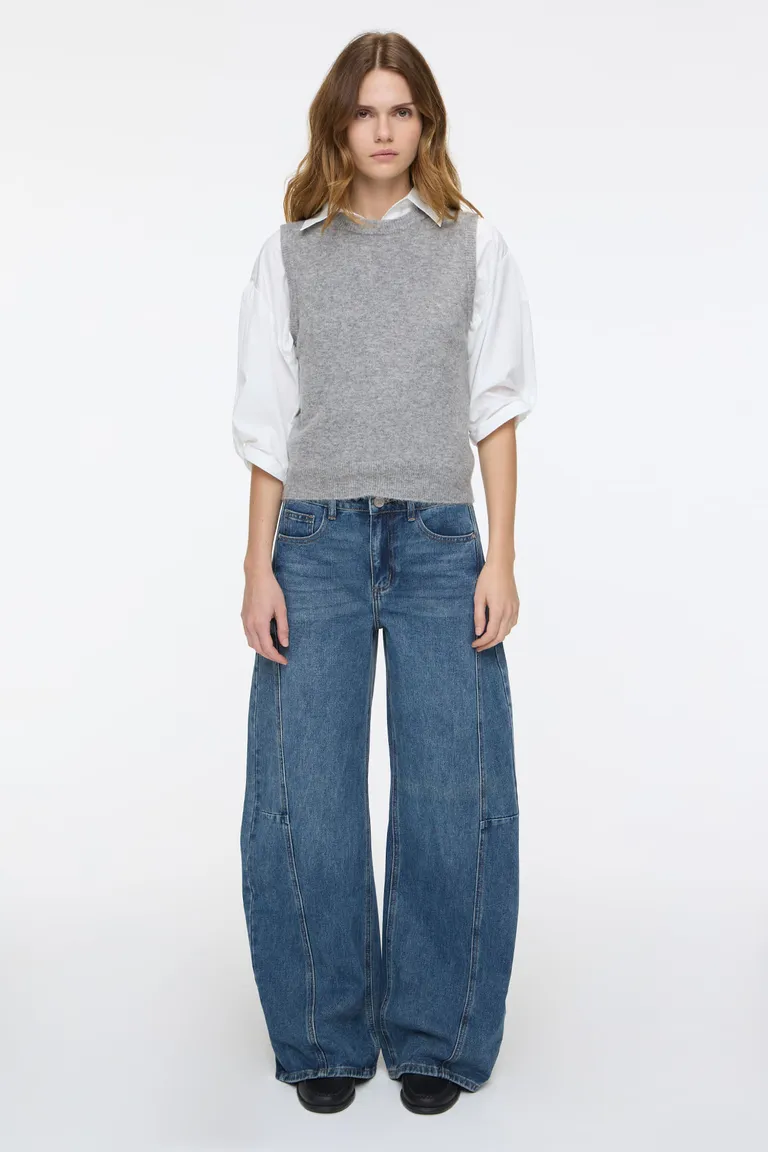 Pantalones de denim con diseño de piernas amplias y holgadas. Presentan detalles de costuras verticales en los laterales y una estructura cómoda de tiro medio, ideales para un look casual y versátil. Cuentan con bolsillos traseros funcionales y cierre central para un ajuste práctico.