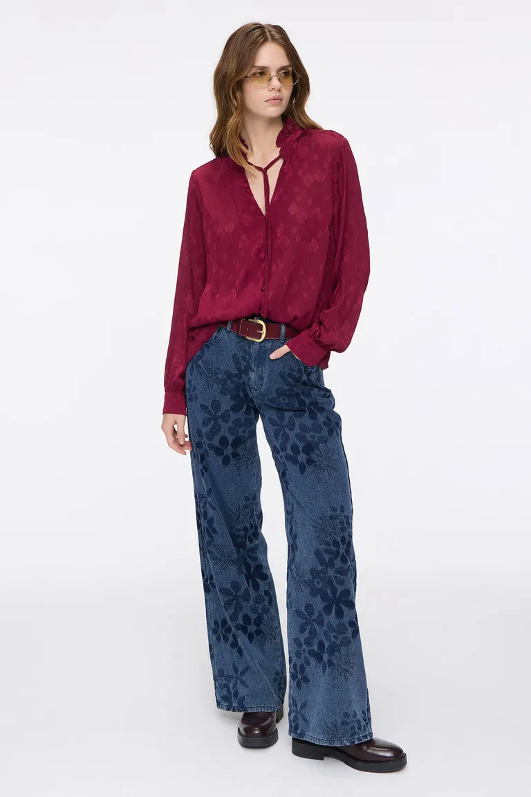Pantalón de denim con corte wide leg y diseño de jacquard floral integral. Presenta un estilo versátil y cómodo con acceso frontal mediante cierre. Ideal para combinar en diversos outfits casuales, ofreciendo una silueta moderna y relajada. Prenda esencial que aporta textura y diseño a tu guardarropa cotidiano.