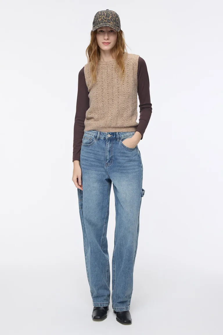 Pantalón de denim con estilo cargo y bolsillos laterales de diseño funcional. Presenta una silueta recta con un lavado clásico y terminaciones con hilo al tono. Incluye acceso frontal con cierre y bolsillos plaqué. Una prenda versátil para combinar en looks casuales y urbanos durante toda la temporada.
