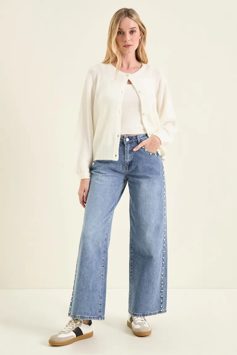 Pantalón de corte amplio con tiro medio y pernera recta. Presenta detalles de perlas aplicadas a lo largo de los laterales y en la zona de los bolsillos. Ideal para combinar en diversos outfits casuales, ofreciendo un ajuste cómodo y un diseño clásico que aporta distinción a cualquier conjunto diario.