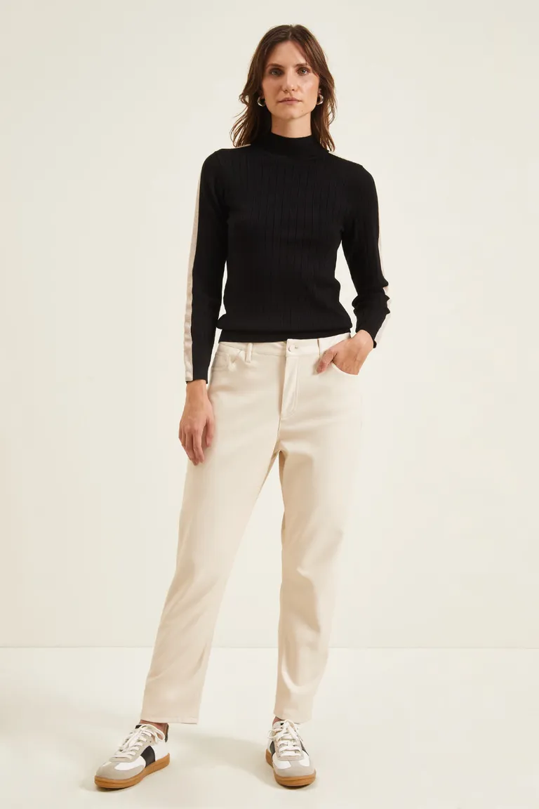 Pantalón de corte ajustado con diseño estilo jeanero, presenta bolsillos en la parte frontal y trasera, cierre con botón metálico y detalle de recorte en la cintura. Una prenda versátil y funcional para completar conjuntos diarios con un estilo refinado y moderno.