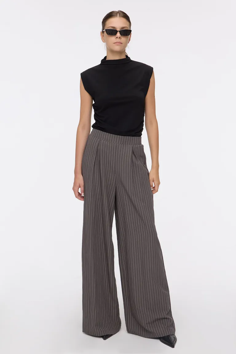 Pantalón de corte palazzo con diseño a rayas verticales. Posee un estilo fluido con pinzas en la parte frontal y una cintura elastizada en la parte posterior para mayor comodidad. Una prenda versátil ideal para crear conjuntos urbanos y modernos.
