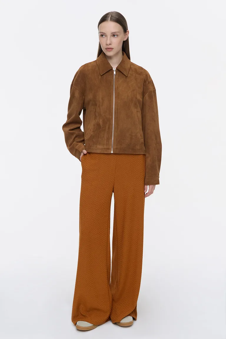Pantalón de tiro alto con corte palazzo. Presenta una textura con diseño geométrico y una cómoda cintura elastizada en la parte posterior junto con bolsillos laterales. Una prenda versátil y cómoda ideal para completar looks urbanos con estilo y movimiento.