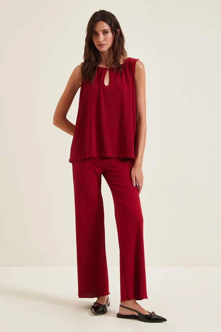Pantalón de mujer con tiro alto y calce recto. Presenta cintura elastizada y detalle de terminación en ruedo, ideal para un look versátil y cómodo. Diseño fluido que aporta elegancia y movimiento a cualquier outfit casual o formal. Disponible en varios talles.