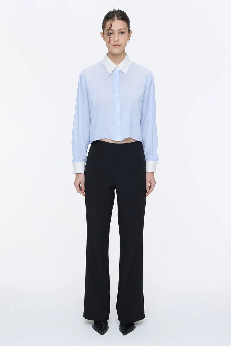 Pantalón sastrero de corte oxford con tiro alto y diseño de cintura ancha. Presenta pinzas de entalle en la parte posterior y bolsillos ojal traseros, con un cierre lateral invisible. Una prenda de silueta elegante y sofisticada para completar conjuntos formales o diarios.