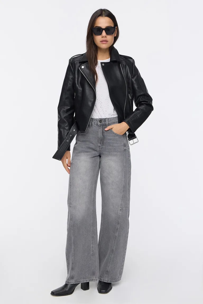 Pantalón de jean con corte de pierna recta y silueta holgada. Presenta un diseño de tiro medio con costuras verticales decorativas en los laterales y detalle de bolsillos traseros estilo carpintero. Cuenta con cierre y botón frontal para su ajuste.