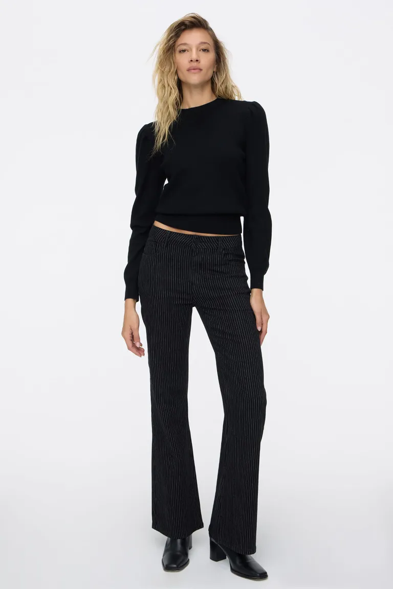 Pantalón de estilo oxford con diseño a rayas verticales. Cuenta con tiro medio y cinco bolsillos funcionales, ideal para un look versátil y clásico. Su calce favorecedor se ajusta a la figura, brindando comodidad para diversas ocasiones. Un complemento esencial para renovar el guardarropa cotidiano con elegancia y estilo.