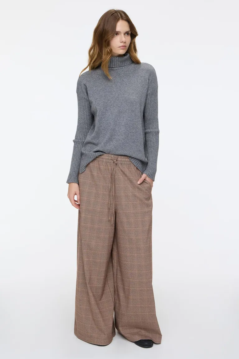 Pantalón de tiro alto con corte estilo palazzo, confeccionado con un diseño estampado a cuadros. Presenta una cintura elastizada con lazo ajustable, bolsillos funcionales en los laterales y un bolsillo aplicado en la parte trasera. Una prenda versátil ideal para crear conjuntos urbanos y modernos con un calce holgado y cómodo para el uso diario.