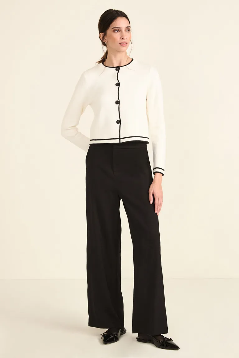 Pantalón de corte sastrero con diseño de pernera recta y tiro alto. Presenta detalles de cintura integrada con cierre de gancho y bolsillos laterales funcionales. Una prenda versátil ideal para completar conjuntos formales o de oficina con un calce impecable y cómodo para el uso diario.