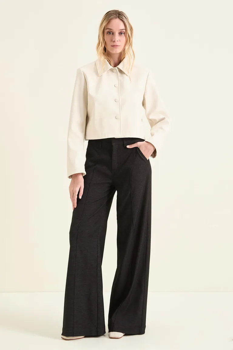 Pantalón sastrero de tiro medio con diseño de pierna ancha y calce recto. Presenta cintura con presillas, cierre frontal con gancho y detalles de costuras verticales. Una opción versátil y elegante para combinar en distintos outfits casuales o formales.