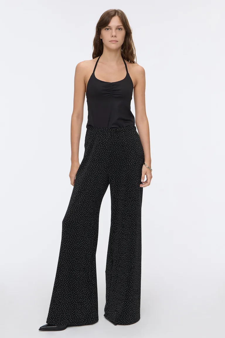 Pantalón de tiro alto con corte wide leg y cintura elastizada. Presenta un diseño en jacquard con detalle de hotfix, ofreciendo una caída fluida y cómoda. Ideal para combinar en diversos outfits diarios.