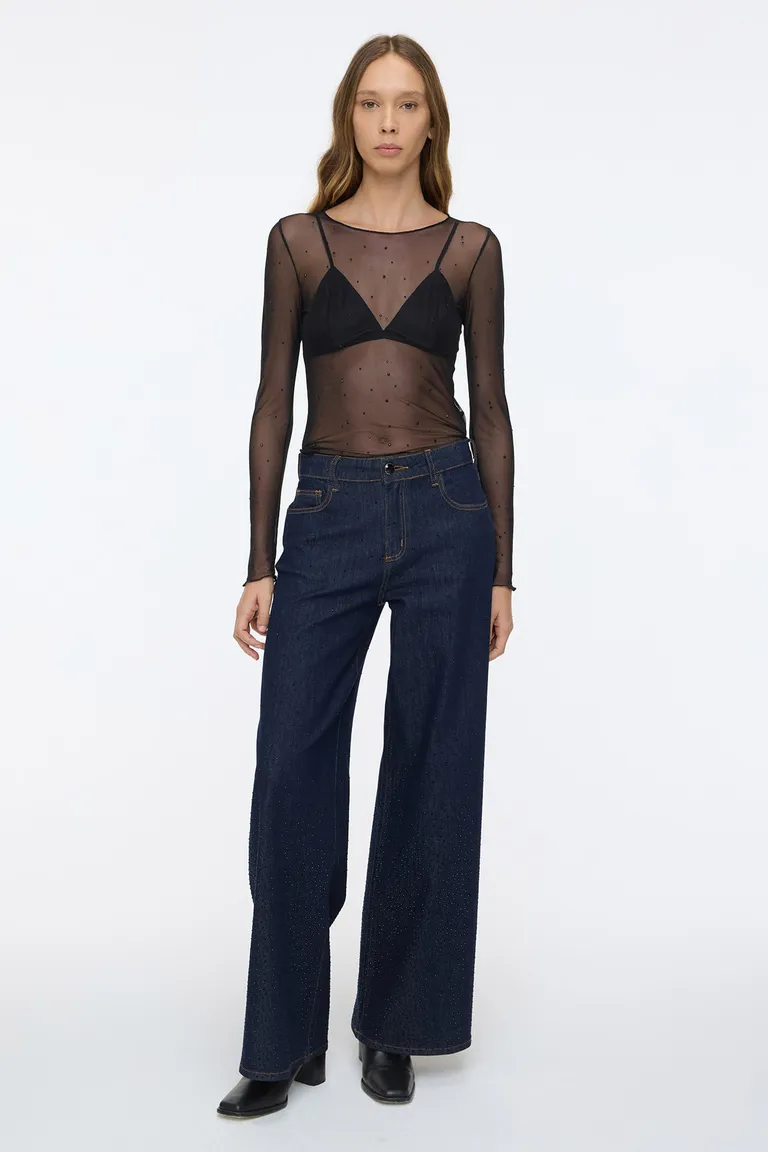Pantalón de denim de pierna wide y tiro alto con detalles de hotfix negro, perfecto para un look casual y moderno. Versátil y cómodo para diferentes ocasiones.