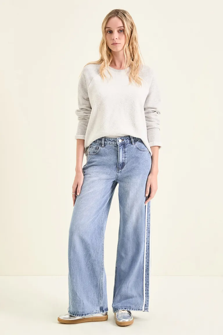 Pantalón de corte amplio con tiro medio. Este modelo presenta un diseño moderno con líneas laterales en contraste y una silueta relajada ideal para combinar con diferentes estilos. Perfecto para sumar versatilidad a tus conjuntos diarios, brindando comodidad y un toque distintivo a tu vestuario casual.