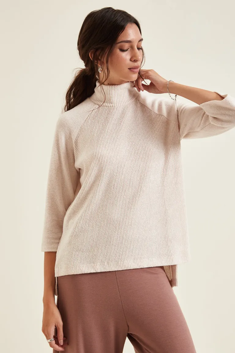 Polera de cuello alto con diseño de mangas ranglán y estructura modular irregular con tajos en los laterales. Esta prenda versátil ofrece un calce cómodo y moderno, ideal para completar conjuntos casuales o urbanos durante el día. Su diseño combina texturas sutiles que aportan dinamismo a cualquier outfit cotidiano, destacándose por su corte holgado y contemporáneo.