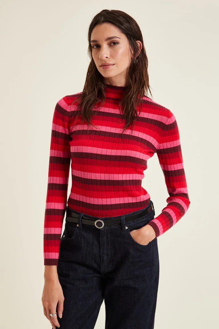 Polera de manga larga con diseño de rayas horizontales en distintos tonos. Presenta cuello alto y un ajuste al cuerpo, ideal para combinar en looks casuales de día o noche. Confeccionada con un tejido suave que brinda comodidad y estilo en cualquier temporada.