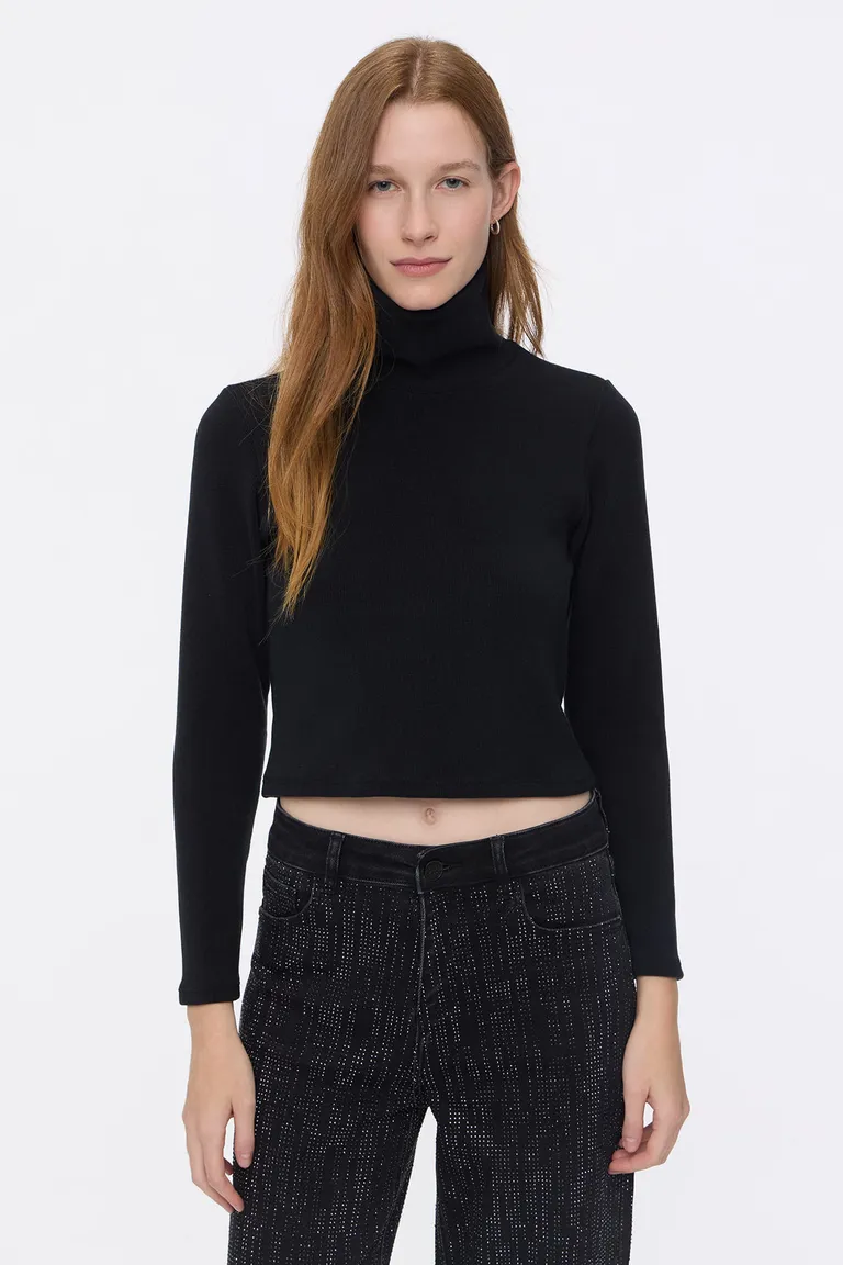 Polera de corte ajustado con cuello alto doble, diseñada con textura acanalada. Presenta un largo a la cintura, ideal para combinar con prendas de tiro alto. Una pieza versátil y esencial para completar conjuntos diarios con un estilo clásico y funcional.