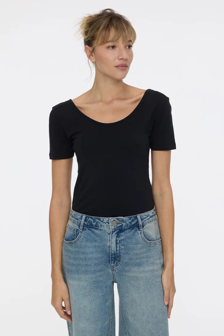 Remera básica de corte ajustado con mangas cortas y escote redondo, diseñada para ofrecer versatilidad en cualquier conjunto cotidiano. Esta prenda de línea clásica cuenta con un detalle de escote más profundo en la espalda, brindando un toque moderno a un estilo tradicional. Ideal para combinar con diversas prendas inferiores, se adapta cómodamente a distintas siluetas para un look diario impecable.