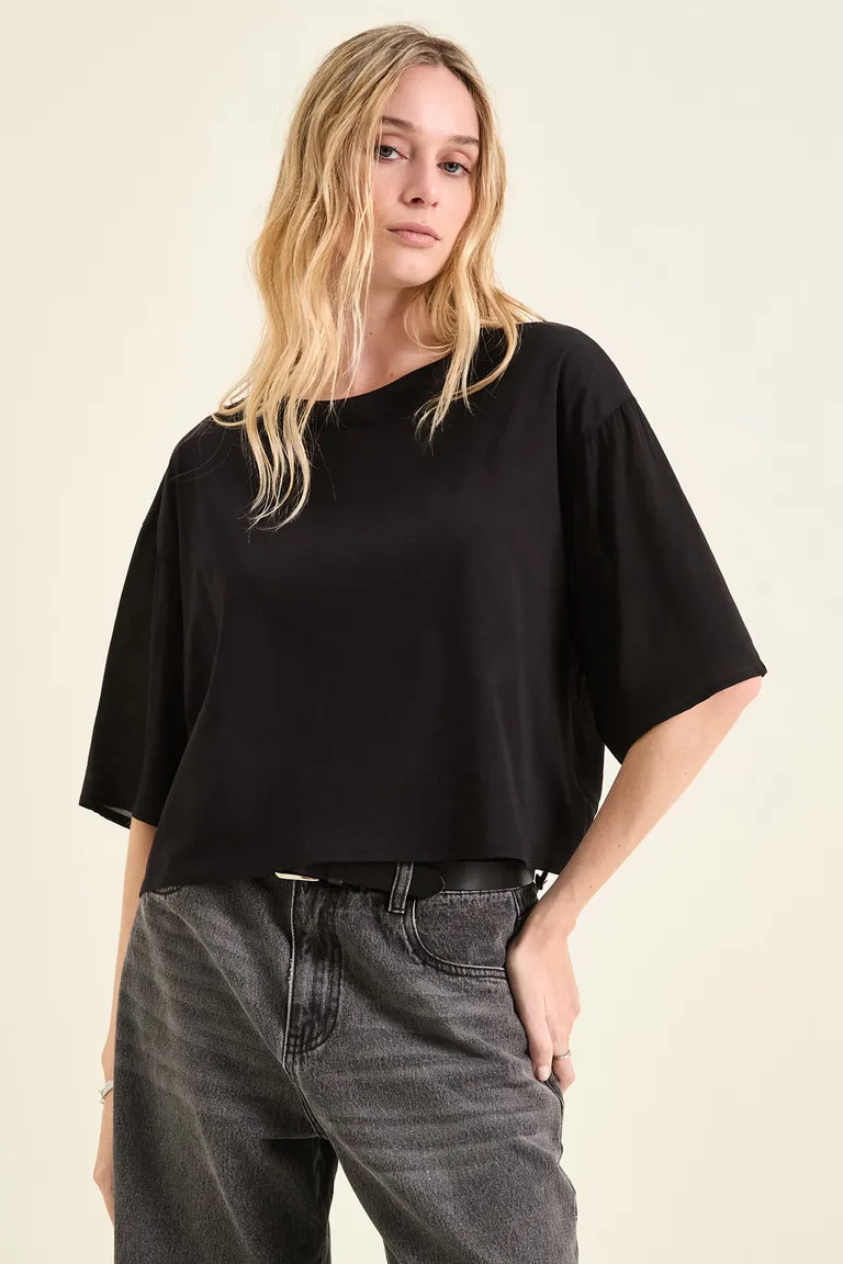 Remera de corte holgado con cuello redondo y mangas cortas. Presenta un diseño de calce cómodo y versátil, ideal para completar equipos informales. Posee detalle de canesú en la espalda y un largo que llega a la altura de la cintura, brindando una caída relajada y un estilo moderno para el uso diario.