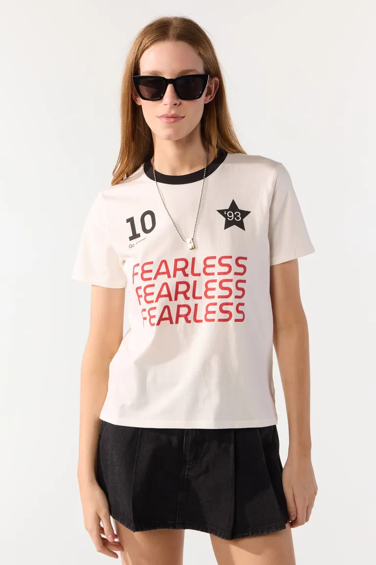 Remera de corte clásico con cuello redondo a contratono. Presenta un diseño gráfico en el frente con tipografía y detalles icónicos que aportan un estilo distintivo a tu look diario. Ideal para combinar con diversas prendas de tu guardarropa.