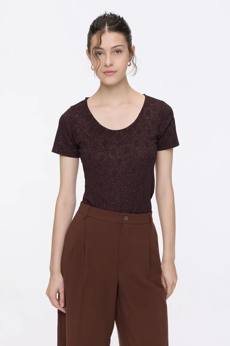 Remera de corte clásico con escote redondo y mangas cortas. Presenta un diseño de textura brillante ideal para combinar en diversos outfits casuales o formales. Esta prenda básica ofrece un ajuste cómodo y versátil, siendo una pieza esencial para el uso diario en cualquier temporada.