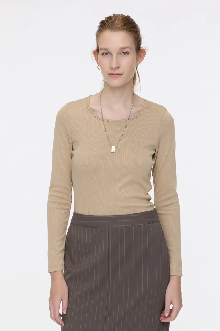 Remera de corte clásico, confeccionada con cuello redondo y mangas largas. Presenta una textura acanalada que aporta un detalle sutil y versátil para combinar en looks diarios. Su diseño ajustado al cuerpo ofrece comodidad para usar sola o como prenda base en capas.