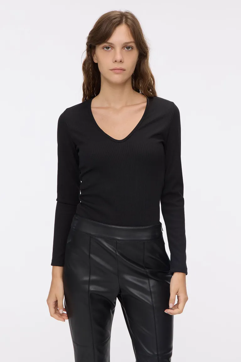 Remera de corte entallado al cuerpo con diseño de mangas largas y escote en V. Una prenda básica y versátil ideal para combinar en diversos conjuntos cotidianos. Presenta un estilo sencillo y minimalista que aporta comodidad para el uso diario en cualquier temporada.