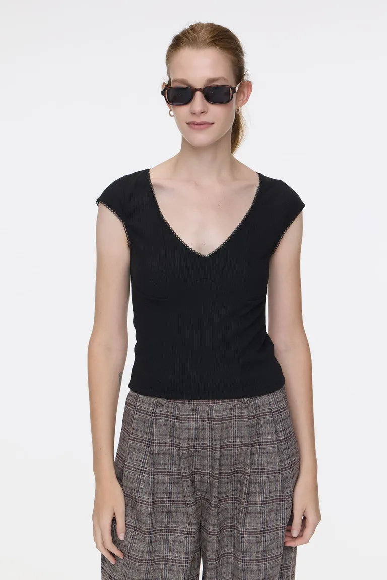 Remera de corte entallado con escote en V y delicadas terminaciones en picot en las mangas. Su diseño minimalista y femenino la convierte en una opción versátil para combinar en cualquier conjunto urbano diario. Presenta un ajuste cómodo al cuerpo con un detalle de recorte sutil bajo el busto.