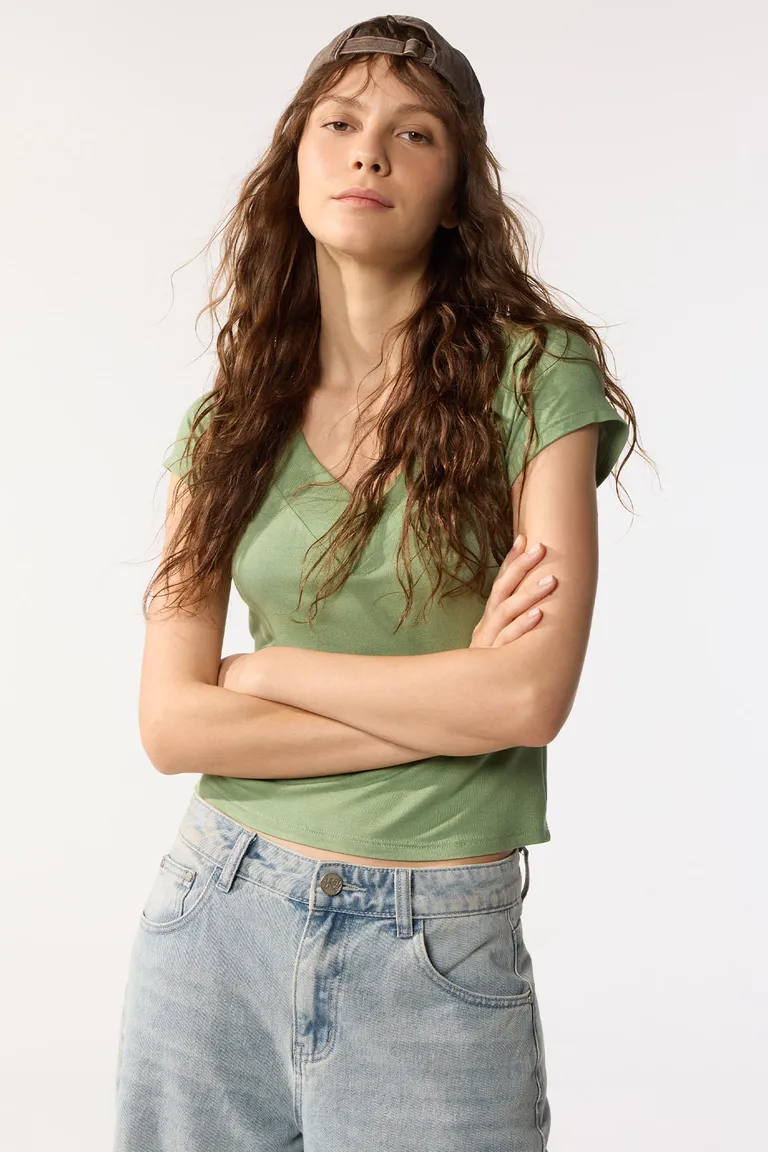 Remera de corte clásico con escote en V tanto en la parte delantera como en la trasera. Presenta mangas cortas tipo ranglán y un calce cómodo, ideal para combinar en looks diarios informales. Su diseño sencillo y versátil permite usarla en diversas ocasiones, siendo una prenda básica esencial para cualquier guardarropa femenino.