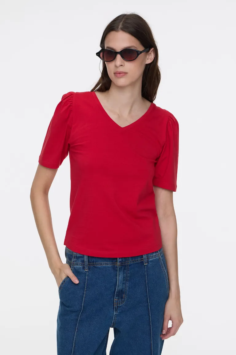 Remera de corte clásico con escote en V y mangas con detalle de volumen en los hombros. Presenta un diseño versátil ideal para combinar en looks diarios. Su calce al cuerpo ofrece comodidad y un estilo sencillo para diferentes ocasiones.