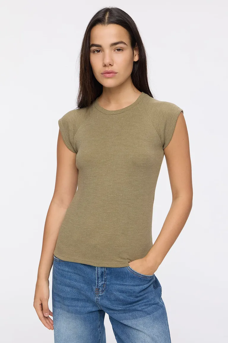 Remera de calce ajustado con cuello redondo y mangas cortas tipo ranglan. Presenta una textura acanalada sutil en toda la prenda, brindando un ajuste cómodo y versátil para diversos outfits. Una opción básica de uso diario, ideal para combinar con jeans o pantalones, manteniendo un diseño limpio y atemporal para la temporada.