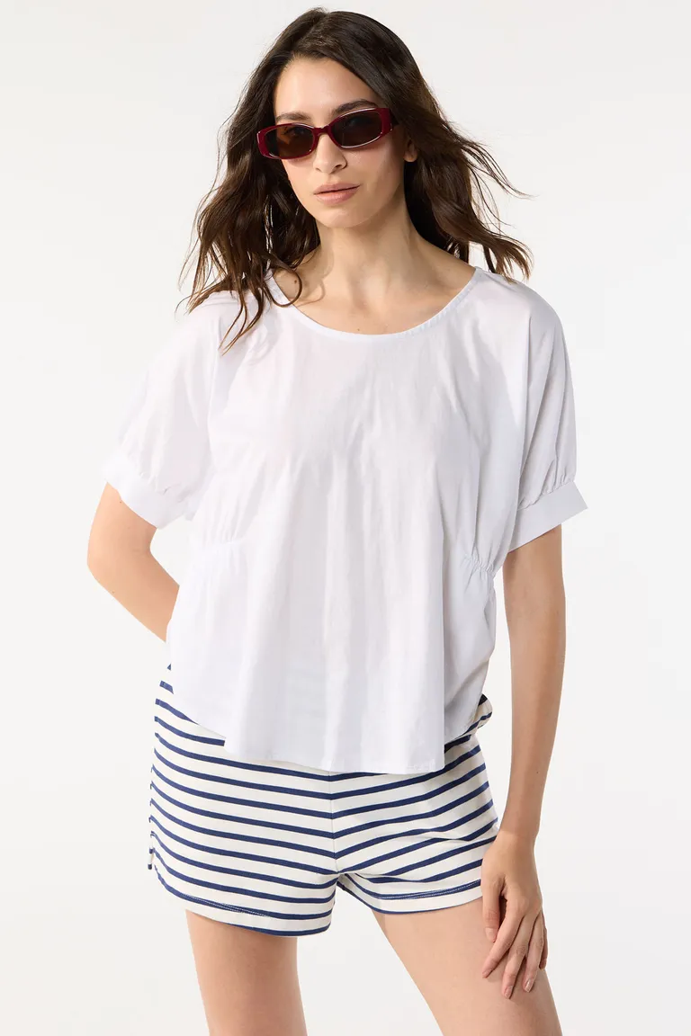 Remera holgada de mangas cortas con cuello redondo y detalle de frunces laterales de Cuesta Blanca