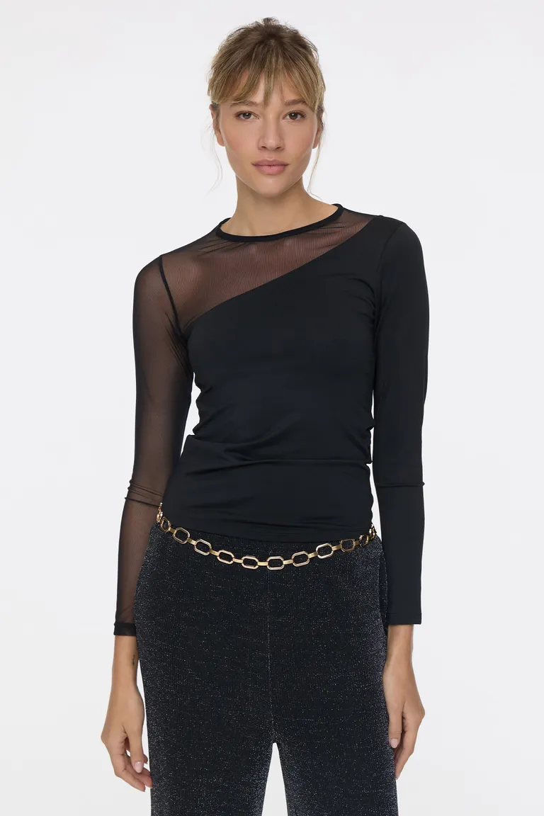 Remera de corte entallado con diseño de escote redondo y mangas largas. Destaca por su detalle de recorte asimétrico en la parte superior que aporta un toque distintivo. Una prenda versátil y moderna ideal para integrar en looks de día o de noche con un estilo sofisticado y actual.