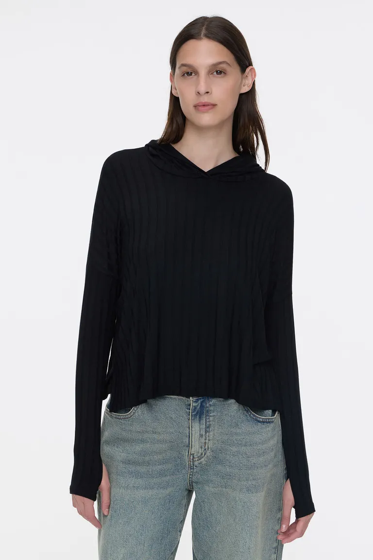 Remerón de mangas largas con detalle de mitón, diseño con capucha incorporada y tajos laterales. Presenta una textura acanalada que aporta un estilo casual y moderno para el uso diario. Versátil y cómodo para combinar en diversos outfits.