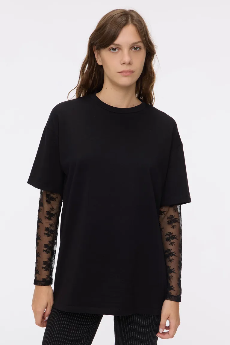 Remerón de corte holgado con cuello redondo y mangas largas confeccionadas en encaje con detalles de diseño. Esta prenda destaca por su estilo versátil, ideal para combinar en looks urbanos de uso diario aportando una textura diferenciada en los brazos.