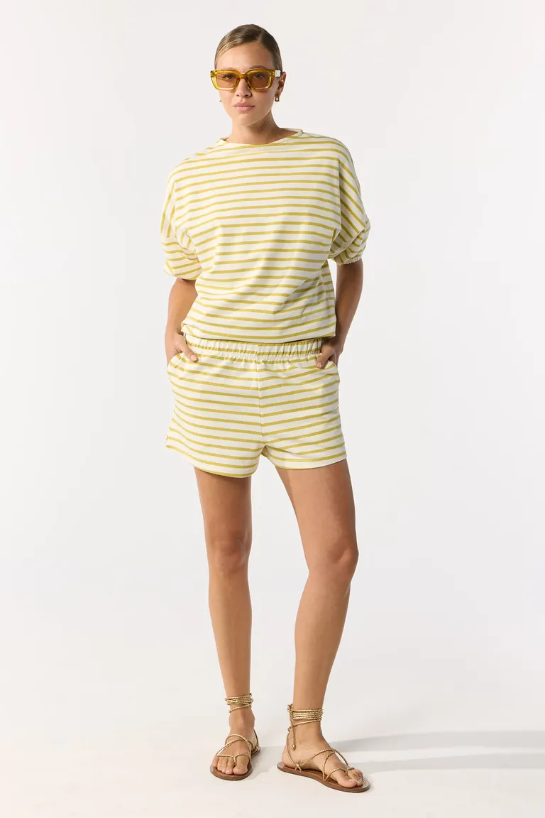 Short con diseño de rayas, confeccionado con cintura elastizada para un ajuste cómodo. Cuenta con prácticos bolsillos laterales y detalles de tajos en el ruedo. Una prenda versátil ideal para crear conjuntos relajados y frescos durante la temporada de verano.