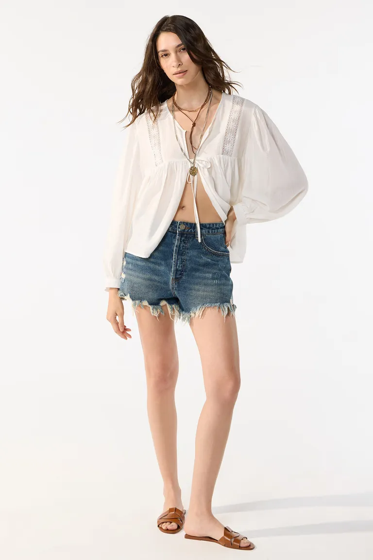 Short de denim con proceso de lavado, detalles de roturas y ruedo desflecado. Diseño clásico de cinco bolsillos con calce ajustado, ideal para completar looks casuales y urbanos en cualquier temporada.