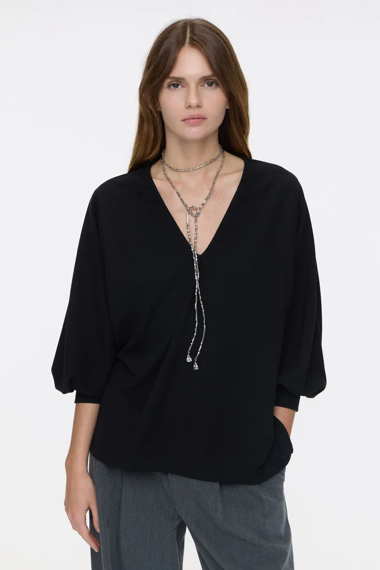 Sweater con escote en v y mangas con frunces. Diseño con largo modular escalonado y aberturas laterales, ideal para un look casual y cómodo. Presenta una silueta relajada con terminaciones en puño, perfecta para combinar en outfits de uso diario.