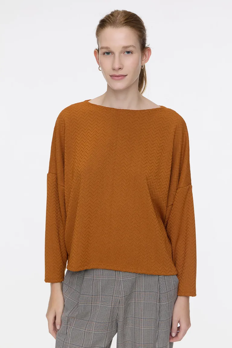 Sweater de mangas tipo dolman con una sutil textura de trama en zig zag. Presenta un corte cómodo y relajado, ideal para combinar en looks diarios. Esta prenda destaca por su diseño sencillo y versátil, aportando una capa de calidez para diversas ocasiones.