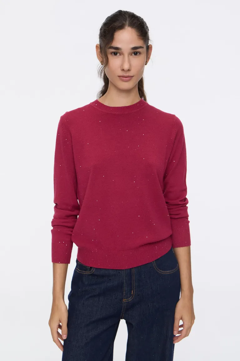Sweater tejido en punto jersey con detalle de micro lentejuelas integradas que brindan un sutil brillo. Presenta un diseño clásico con cuello redondo y terminaciones en ribb en puños y cintura, ideal para integrar en looks cotidianos o de noche. Su calce es cómodo y versátil, brindando una textura suave al tacto y un estilo elegante para diversas ocasiones.