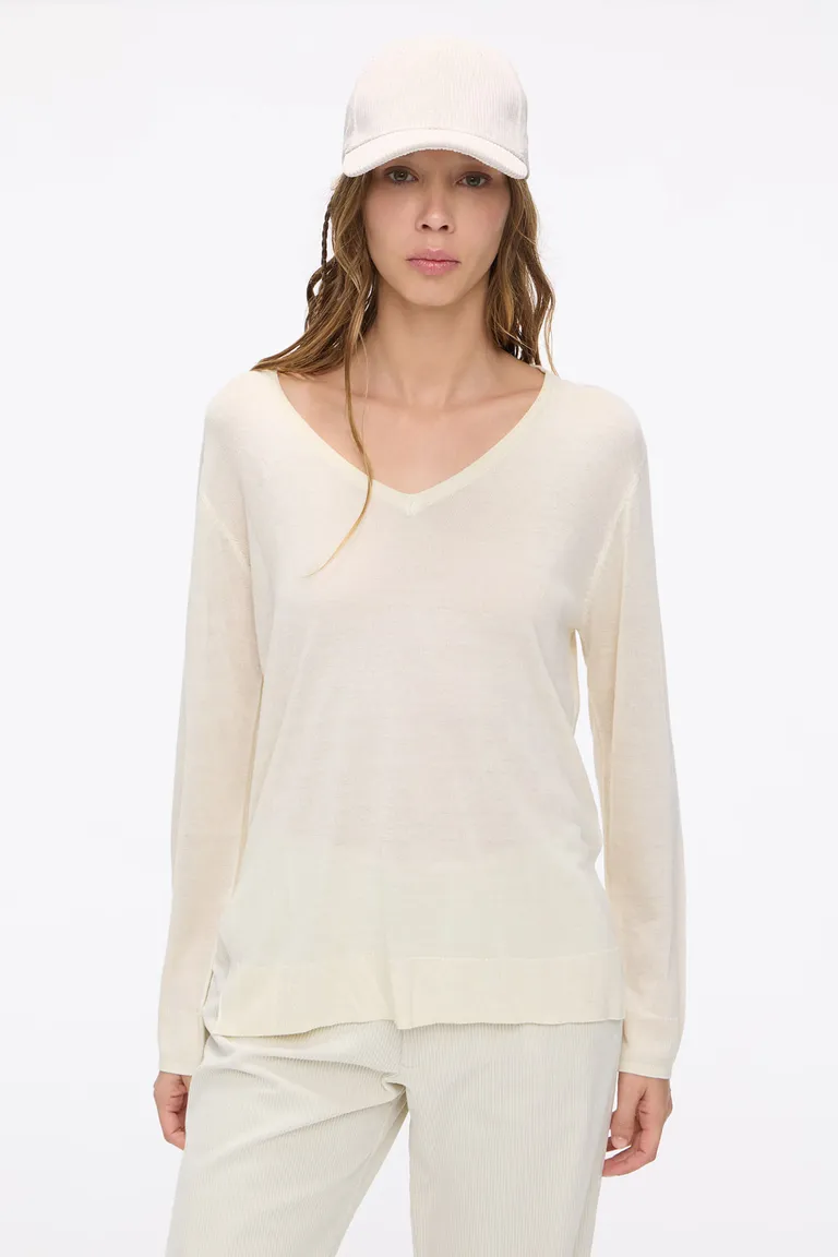 Sweater tejido en punto jersey con escote en V profundo y borde en ribb. Presenta un diseño de corte relajado con espalda más larga que el delantero y aberturas laterales, ideal para el uso diario en diversas estaciones. Su calce cómodo y liviano permite crear conjuntos versátiles para renovar tu vestuario cotidiano.