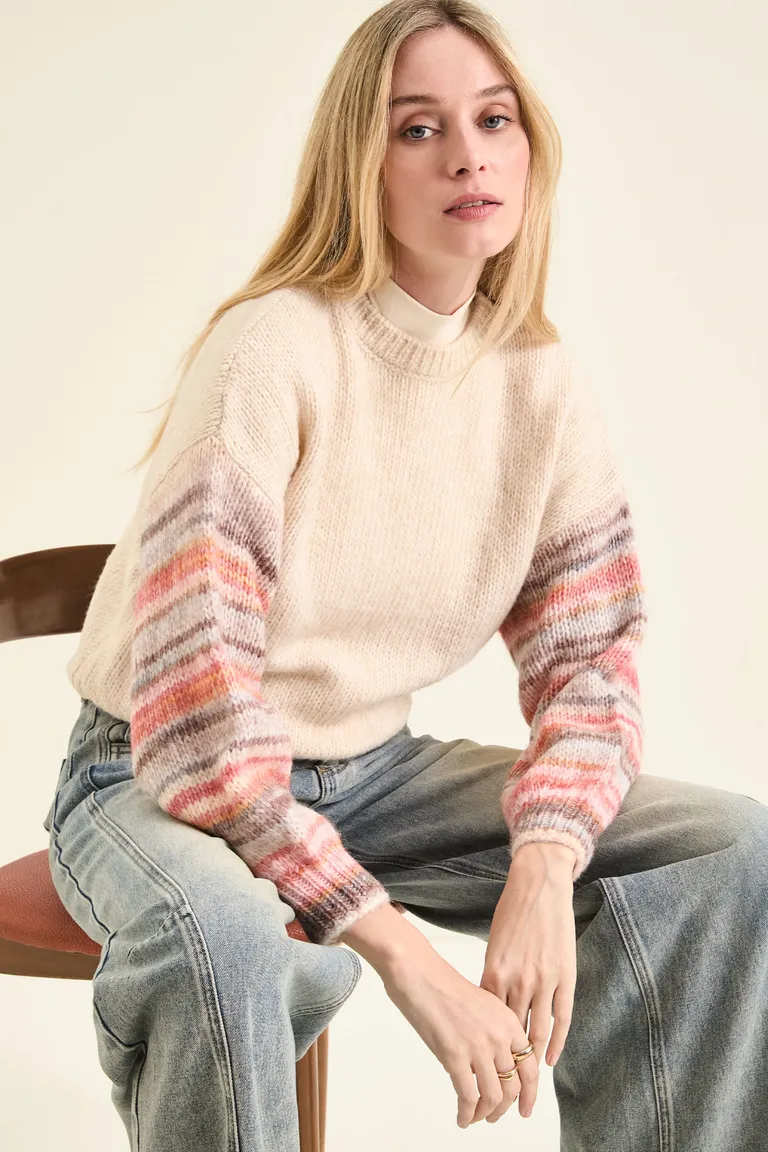 Sweater tejido con escote redondo, diseñado con mangas que presentan un patrón de rayas multicolor. La prenda destaca por sus detalles en punto rib en el cuello, los puños y la cintura, junto con un suave frunce en las muñecas. Una opción versátil y cómoda para complementar tus outfits de temporada con un estilo único y refinado.