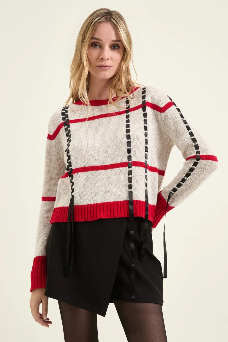 Sweater tejido con rayas horizontales, cuello redondo y mangas largas. Presenta detalles de cintas de raso aplicadas tanto en el frente como en las mangas, con terminaciones acanaladas en puños, cintura y escote. Una prenda de diseño casual ideal para complementar outfits urbanos de temporada.