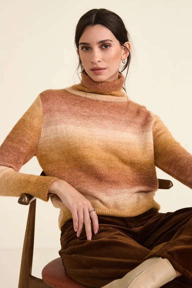Sweater tejido con diseño de cuello polera y mangas largas. Presenta un efecto de rayas degradé en tonos cálidos, ideal para complementar conjuntos de invierno. Su diseño incluye terminaciones en punto rib en el cuello, puños y ruedo, brindando una caída cómoda y versátil para el uso cotidiano.