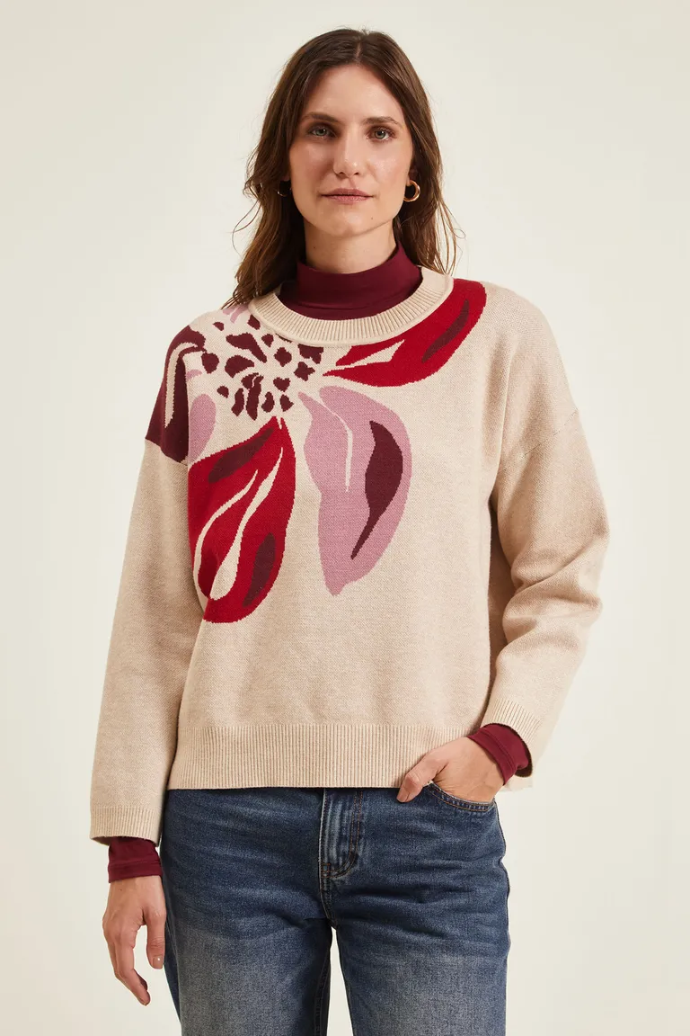Sweater tejido con cuello redondo y diseño jacquard de flor. Presenta un corte cómodo, mangas largas con puños definidos y terminación en rib en la cintura. Ideal para combinar en looks diarios con jeans o pantalones sastreros, aportando textura y estilo al conjunto.