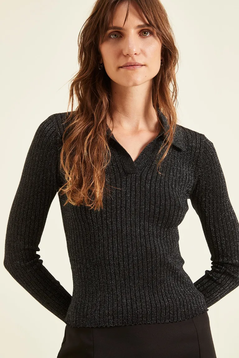 Sweater de manga larga con diseño de tejido acanalado y cuello camisero. Una prenda versátil ideal para complementar outfits urbanos de uso cotidiano, aportando textura y un estilo distinguido gracias a su acabado con brillo sutil. Corte entallado al cuerpo que ofrece comodidad y calce anatómico para diversas ocasiones.