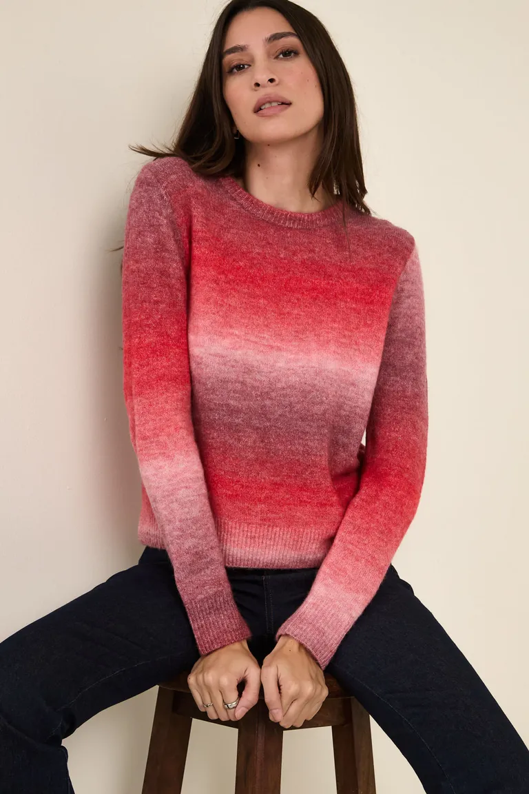 Sweater tejido con diseño de rayas degradé, presenta cuello redondo, puños y cintura terminados en punto rib. Una prenda cómoda y versátil ideal para completar looks cotidianos con estilo.