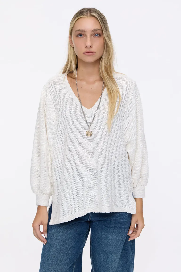 Sweater tejido con escote en V y mangas largas con puños fruncidos. Diseño de corte holgado con largo asimétrico y tajos en los laterales, ideal para un look casual y cómodo. Presenta una textura definida que aporta versatilidad al uso diario.
