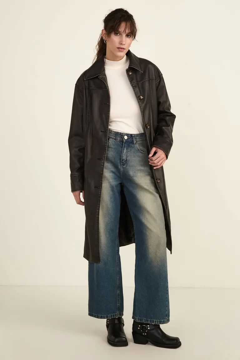 Tapado de corte largo con cuello camisero, diseñado con botones frontales, presillas en la cintura y bolsillos laterales. Un abrigo versátil, forrado y con costuras definidas, ideal para completar equipos urbanos con estilo moderno.