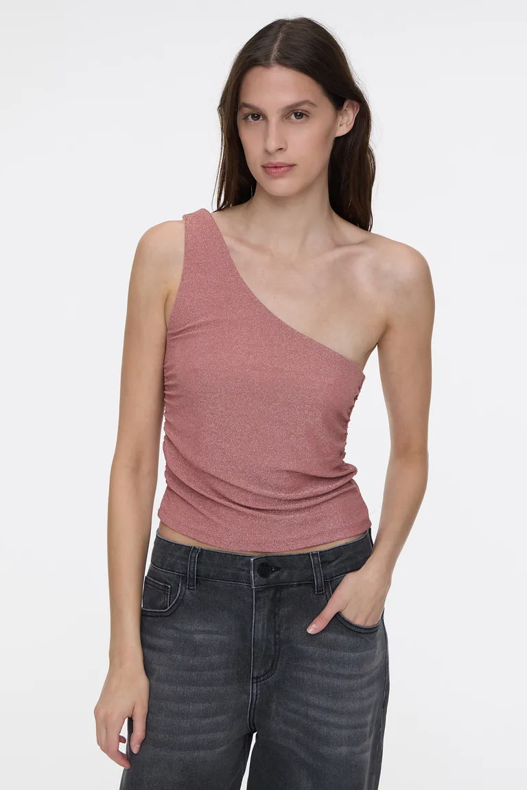 Top asimétrico con diseño de un solo hombro descubierto y detalles de frunces en los laterales. Presenta una textura brillante ideal para combinar en diversos outfits casuales o formales. Su corte entallado se adapta a la silueta, ofreciendo una opción versátil y moderna para el guardarropa femenino.